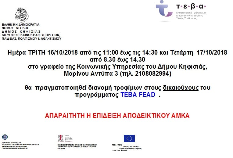 Στο πλαίσιο του Επιχειρησιακού Προγράμματος «Επισιτιστικής και Βασικής Υλικής Συνδρομής για το Ταμείο Ευρωπαϊκής Βοήθειας για τους Απόρους (TEBA/FEAD)», θα πραγματοποιηθεί από τον Δήμο Κηφισιάς διανομή ειδών τροφίμων στους δικαιούχους του προγράμματος ΚΕΑ – ΤΕΒΑ, την Τρίτη 16/10/2018 από τις 11:00 έως τις 14:30 και Τετάρτη 17/10/2018 από 8.30 έως 14.30 στο γραφείο Κοινωνικής Υπηρεσίας του Δήμου Κηφισιάς (Μαρίνου Αντύπα).
