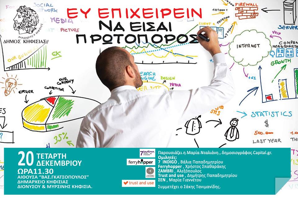 Την Τετάρτη 20 Δεκεμβρίου θα πραγματοποιηθεί εκδήλωση επιχειρηματικότητας που θα απευθύνεται σε μαθητές λυκείων του Δήμου Κηφισιάς.