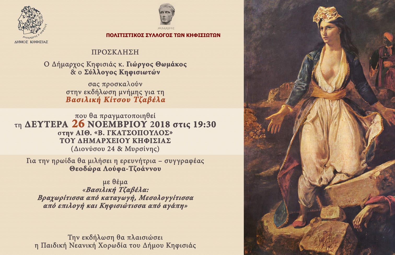 Ο Δήμαρχος Κηφισιάς κ. Γιώργος Θωμάκος & ο Σύλλογος Κηφισιωτών σας προσκαλούν στην εκδήλωση μνήμης για τη Βασιλική Κίτσου Τζαβέλα που θα πραγματοποιηθεί τη Δευτέρα 26 Νοεμβρίου 2018 στις 19:30 στην αίθ. «Β. Γκατσόπουλος» του Δημαρχείου Κηφισιάς (Διονύσου 24 & Μυρσίνης)