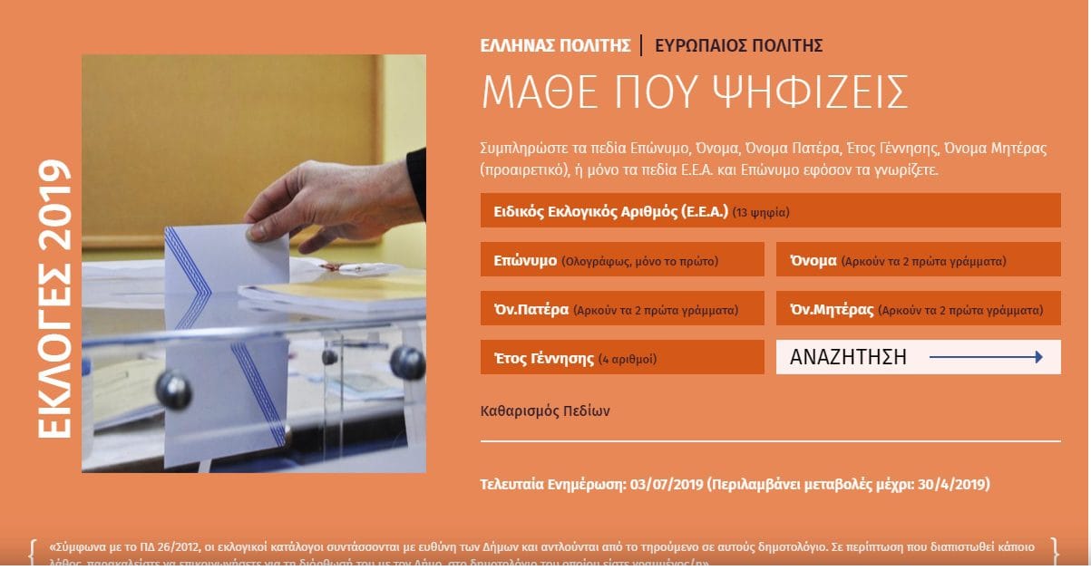 Οι ψηφοφόροι μπορούν να δουν σε ποιο εκλογικό τμήμα θα ασκήσουν το εκλογικό τους δικαίωμα της 7ης Ιουλίου 2019, στο ΠΟΥ ΨΗΦΙΖΩ, την online εφαρμογή του ΥΠΕΣ.