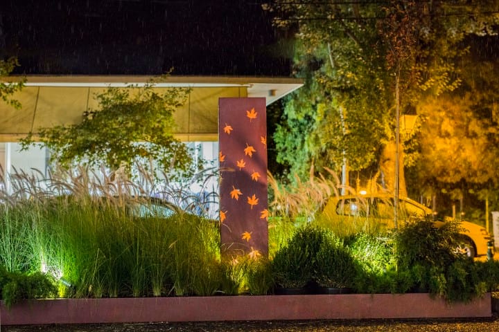 Κόκκινες ναντίνες ξεχωρίζουν ανάμεσα από πράσινους όγκους πυξαριών και γιουνίπερων ενώ χρυσοκίτρινα κάρεξ και αέρινα ροζ πενισέτουμ πλαισιώνουν μια μεταλλική φωτιζόμενη σύνθεση με πλατανόφυλλα που μοιάζουν να αιωρούνται.