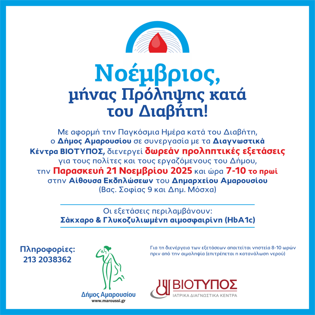 Ο Δήμος Αμαρουσίου, με αφορμή την Παγκόσμια Ημέρα κατά του Διαβήτη, διοργανώνει μία ολοκληρωμένη δράση ενημέρωσης και πρόληψης για όλους τους πολίτες. Στόχος μας είναι να αναδείξουμε τη σημασία της έγκαιρης διάγνωσης, της σωστής διαχείρισης και του υγιεινού τρόπου ζωής, μέσα από επιστημονική γνώση και πρακτική καθοδήγηση.
