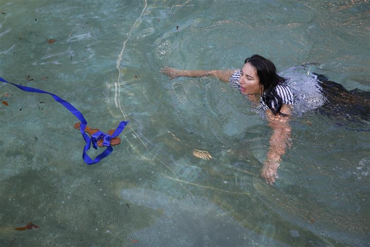 Η Στεφανία Γεροντάκη εργαζόμενη του Δήμου, δε δίστασε να βουτήξει στα νερά της λίμνης προκειμένου να πιάσει τον Σταυρό και να πάρει την ευλογία του ιερέα.