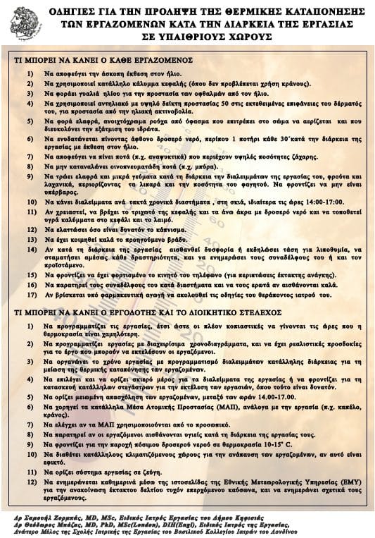 Γι’ αυτό ο Δήμος Κηφισιάς δημοσιοποίησε ευρέως αφίσα με λεπτομερής οδηγίες για την πρόληψη της θερμικής καταπόνησης όσων εργάζονται στο ύπαιθρο το καλοκαίρι. Την επιμέλεια και σύνταξη των οδηγιών είχε ο Ειδικός Ιατρός Εργασίας του Δήμου Κηφισιάς Σαμουήλ Ζορμπάς, MD, MSc.