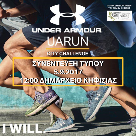 Ο Δήμος Κηφισιάς και η Under Armour και σας προσκαλούν στη Συνέντευξη Τύπου για τον 2ο Αγώνα Δρόμου “UA RUN CITY CHALLENGE” στην Κηφισιά, παρουσία όλων των Χορηγών και Εκπροσώπων Αθλητών που συμβάλουν στη διοργάνωση. Ο Αγώνας έχει και φιλανθρωπικό χαρακτήρα, αποδίδοντας μέρος των εσόδων στην AMKE Άγγιγμα Ζωής.