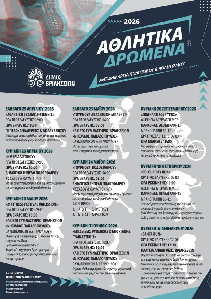 Τα Βριλήσσια ετοιμάζονται να ζωντανέψουν στον ρυθμό του αθλητισμού με την έναρξη του ετήσιου προγράμματος “Αθλητικά Δρώμενα 2026”. Αυτή η φιλόδοξη πρωτοβουλία του Δήμου Βριλησσίων δεν αποτελεί απλώς μια σειρά από αθλητικές εκδηλώσεις, αλλά μια ολιστική προσέγγιση στην προώθηση της φυσικής άσκησης, της σωματικής και πνευματικής ευεξίας, καθώς και της ενεργού συμμετοχής των πολιτών όλων των ηλικιών. Στόχος είναι η δημιουργία ενός περιβάλλοντος όπου ο αθλητισμός γίνεται προσβάσιμος και ευχάριστος για όλους, ενισχύοντας την αίσθηση της κοινότητας και την υιοθέτηση ενός πιο υγιούς τρόπου ζωής. Η περσινή επιτυχία των δρώμενων τροφοδοτεί τις προσδοκίες για ακόμη μεγαλύτερη απήχηση και συμμετοχή, καθιστώντας τα “Αθλητικά Δρώμενα 2026” ένα σημαντικό σημείο αναφοράς στον αθλητικό και κοινωνικό χάρτη της περιοχής. Έχει δοθεί ιδιαίτερη έμφαση στην ποικιλομορφία των προσφερόμενων αθλημάτων και δραστηριοτήτων, ώστε να καλύπτονται όλα τα ενδιαφέροντα και τα επίπεδα φυσικής κατάστασης.